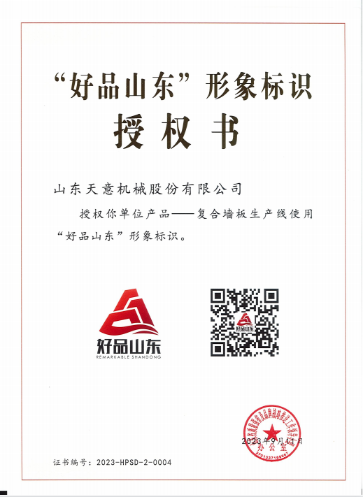 9月12日,由山東省市場監管局會同省委宣傳部、省發展改革委、淄博市政府共同主辦的山東省2023年“質量月”啟動儀式在淄博舉行。活動發布第二批“好品山東”品牌遴選名單,共計105個品牌,天意機械憑借復合墻板生產線入選“好品山東”品牌遴選名單。
