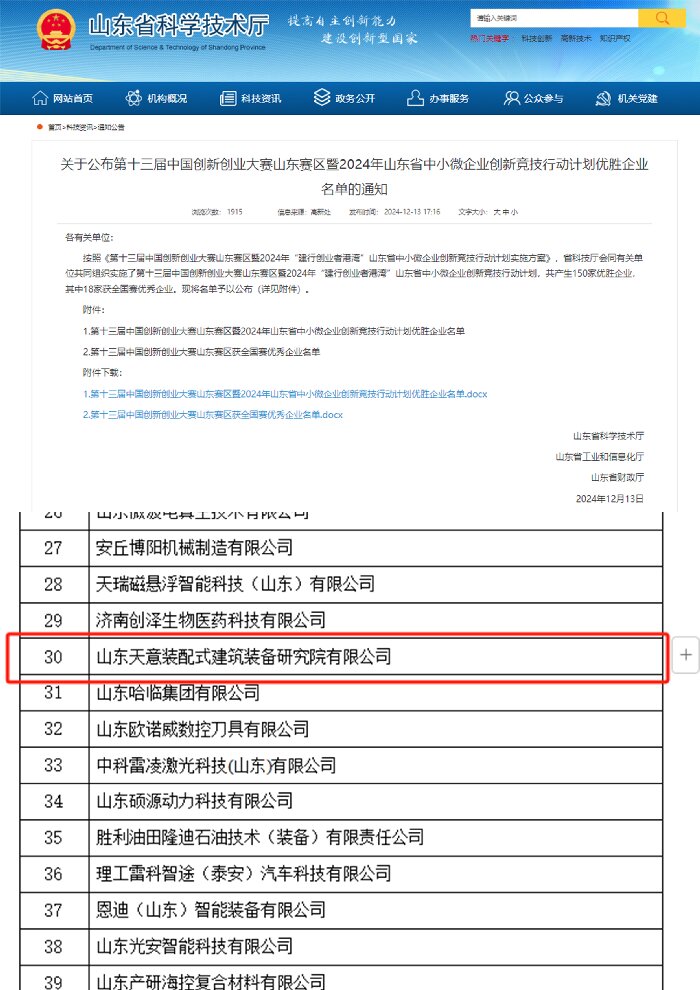 日前,山東省科技廳會同有關(guān)單位共同組織實施了第十三屆中國創(chuàng)新創(chuàng)業(yè)大賽山東賽區(qū)暨2024年“建行創(chuàng)業(yè)者港灣”山東省中小微企業(yè)創(chuàng)新競技行動計劃,山東天意裝配式建筑裝備研究院有限公司成功入選優(yōu)勝企業(yè)。