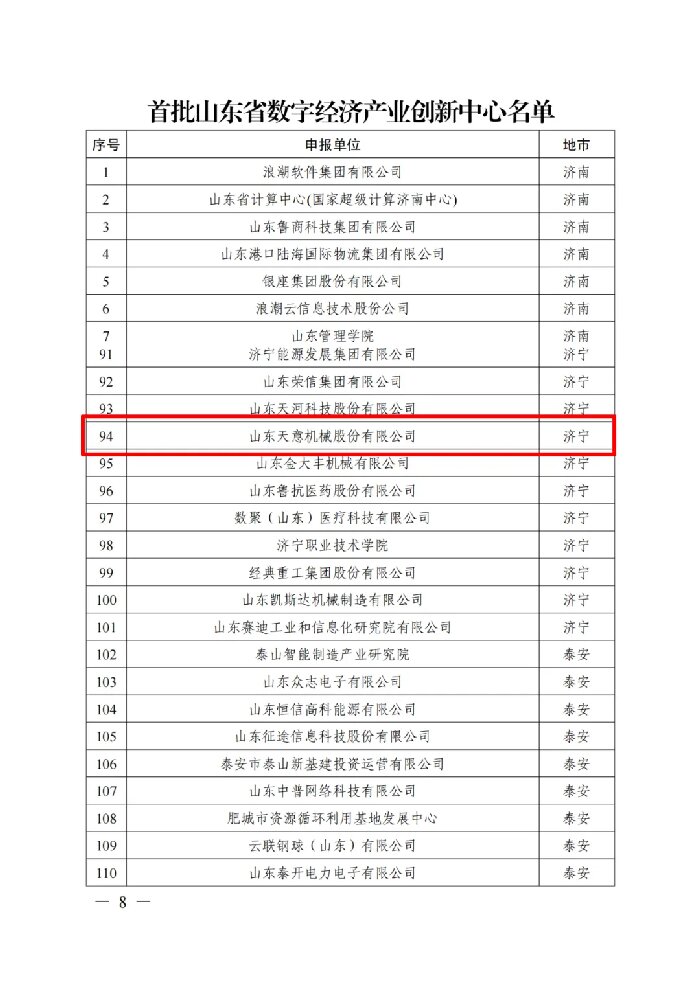 6月,省工信廳公布了首批山東省數字經濟創新平臺名單,天意機械入選首批數字經濟產業創新中心名單。