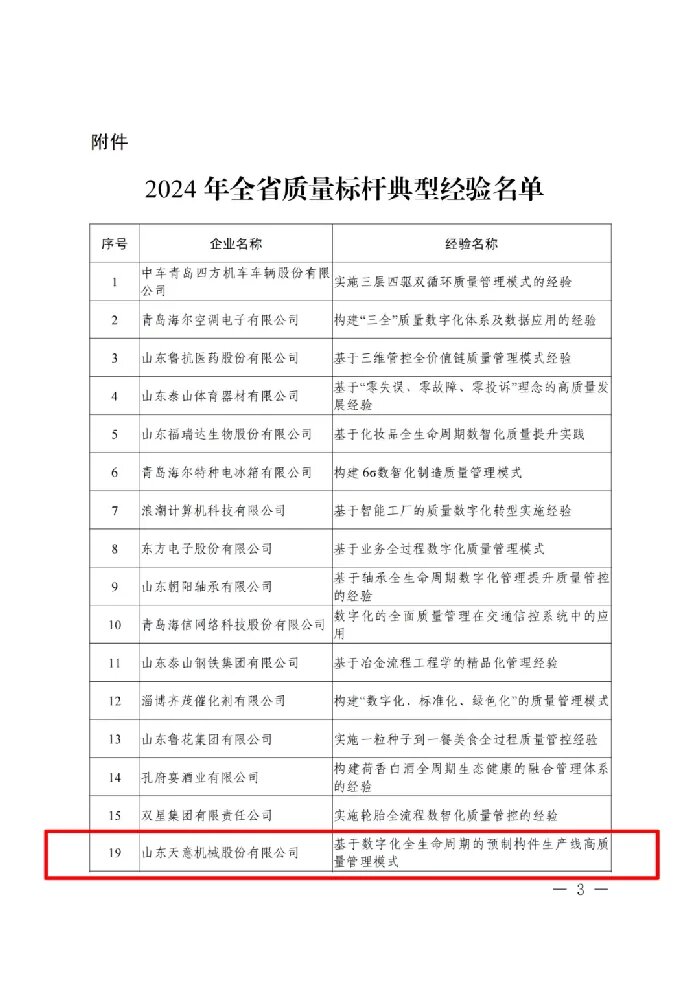 7月,山東省工業和信息化廳公布了全省質量標桿獎。天意機械憑借在關鍵過程質量控制方向的不懈探索,以基于數字化全生命周期的預制構件生產線高質量管理模式斬獲“2024年全省質量標桿”。