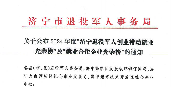 濟寧市退役軍人事務局公布2024年度“濟寧退役軍人創業帶動就業光榮榜”及“就業合作企業光榮榜”,其中,山東天意機械股份有限公司位列“濟寧退役軍人就業合作企業光榮榜”。